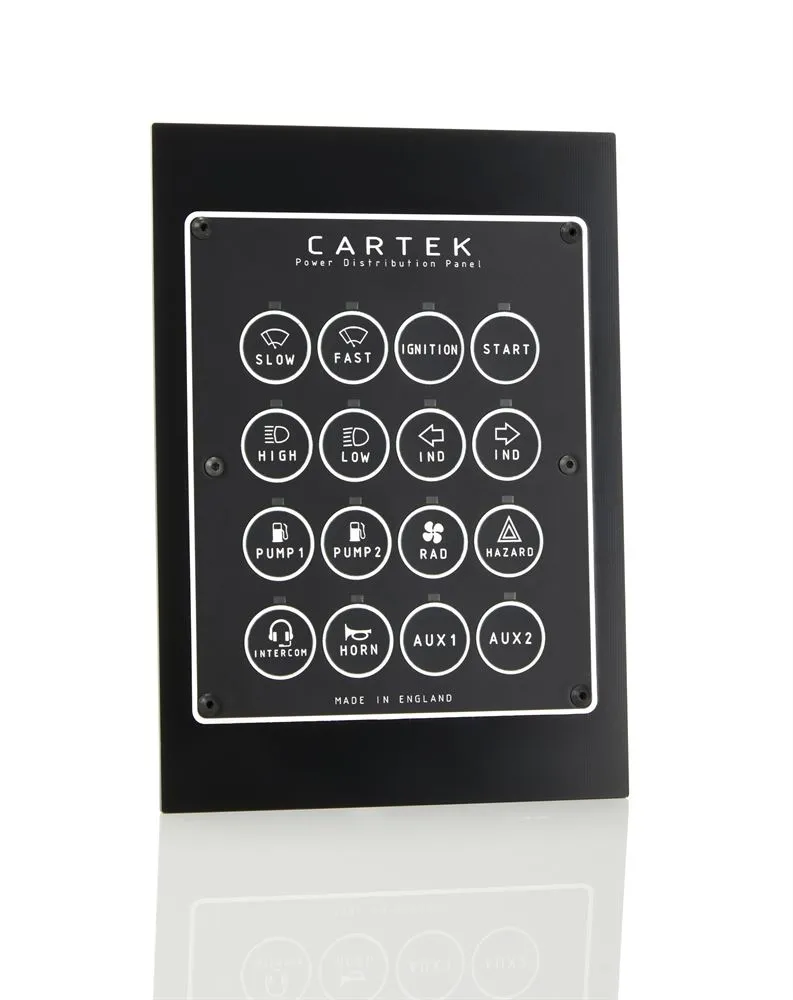 Panel dystrybucji zasilania CARTEK, to w pełni zintegrowane, w pełni elektroniczne rozwiązanie przeznaczone do dystrybucji zasilania w samochodach wyścigowych i rajdowych. Zaprojektowane, aby zastąpić 16 bezpieczników, przekaźników i przełączników, a także różne systemy sterowania. Jednostki te znacznie upraszczają okablowanie, skracają czas budowy, zmniejszają wagę i maksymalizują niezawodność.