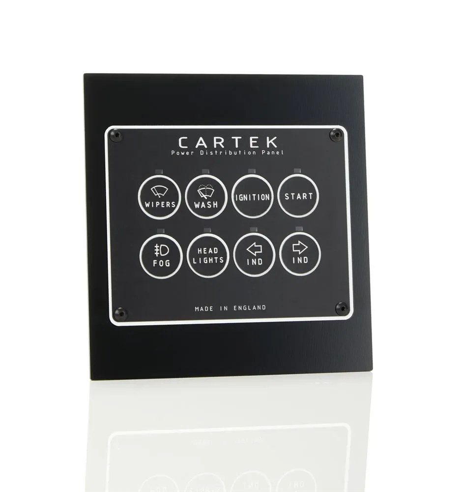 Panel dystrybucji zasilania Cartek Retro Edition, to w pełni zintegrowane, w pełni elektroniczne rozwiązanie przeznaczone do dystrybucji zasilania w samochodach wyścigowych i rajdowych. Zaprojektowane, aby zastąpić 8 bezpieczników, przekaźników i przełączników, a także różne systemy sterowania. Jednostki te znacznie upraszczają okablowanie, skracają czas budowy, zmniejszają wagę i maksymalizują niezawodność.