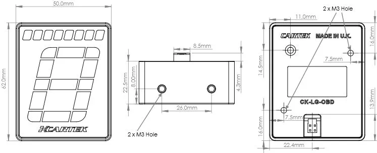 Wskaźnik biegów firmy Cartek to urządzenie montowane na desce rozdzielczej, które ma na celu wskazanie kierowcy aktualnie wybranego biegu, ale zawiera również sekwencyjny wyświetlacz zmiany biegów, który może wskazać kierowcy optymalny czas na zmianę biegu na wyższy. Wybrany bieg jest wskazywany przez duży, wielokolorowy, 7-segmentowy wyświetlacz numeryczny, podczas gdy funkcja shift-light jest wyświetlana w górnej części urządzenia przez 8 wielokolorowych diod LED.