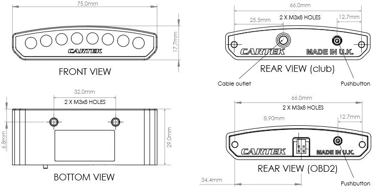 SHIFT-LIGHT (Club) firmy CARTEK to urządzenie montowane na desce rozdzielczej, które ma na celu wskazanie kierowcy optymalnego czasu zmiany biegu na wyższy - w celu uzyskania maksymalnych osiągów silnika. Urządzenie zawiera 8 wielokolorowych diod LED, które tworzą sekwencję wyświetlania, która rozpoczyna się przy prędkości obrotowej silnika przed osiągnięciem optymalnej prędkości i kończy się przy dokładnie optymalnej prędkości, dając kierowcy wczesne wskazanie, aby zmienić bieg na wyższy przed osiągnięciem ogranicznika obrotów lub uszkodzeniem silnika.