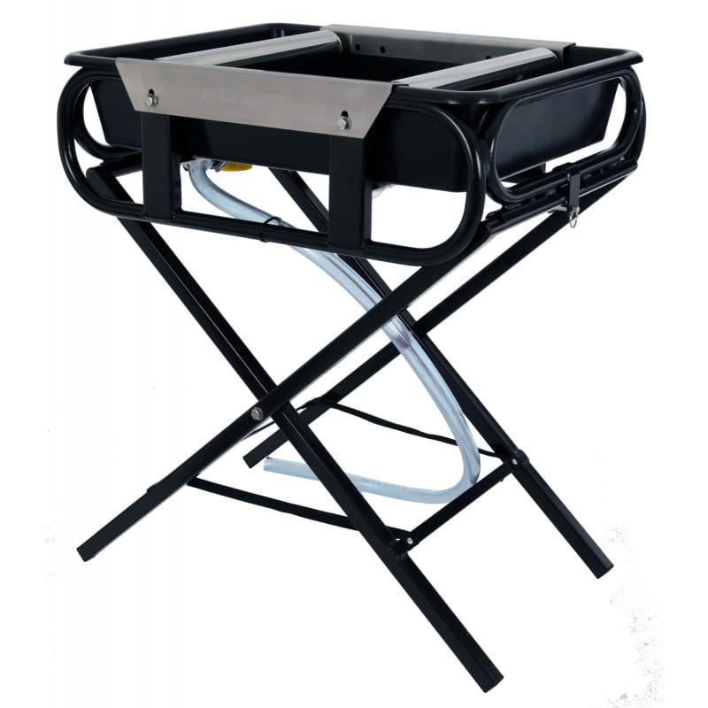 Wyposażona w rolki ze stali nierdzewnej o regulowanej szerokości, aby dopasować je do różnych średnic kół i opon.