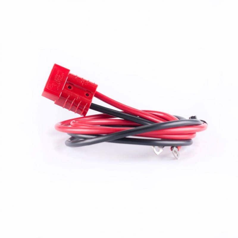 Przewody o grubości 10 mm w podwójnej osłonie zakończone płaskim złączem ANDERSON 50A oraz konektorami oczkowymi 6 mm.